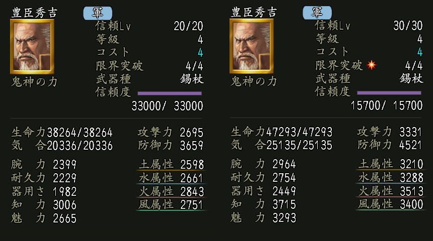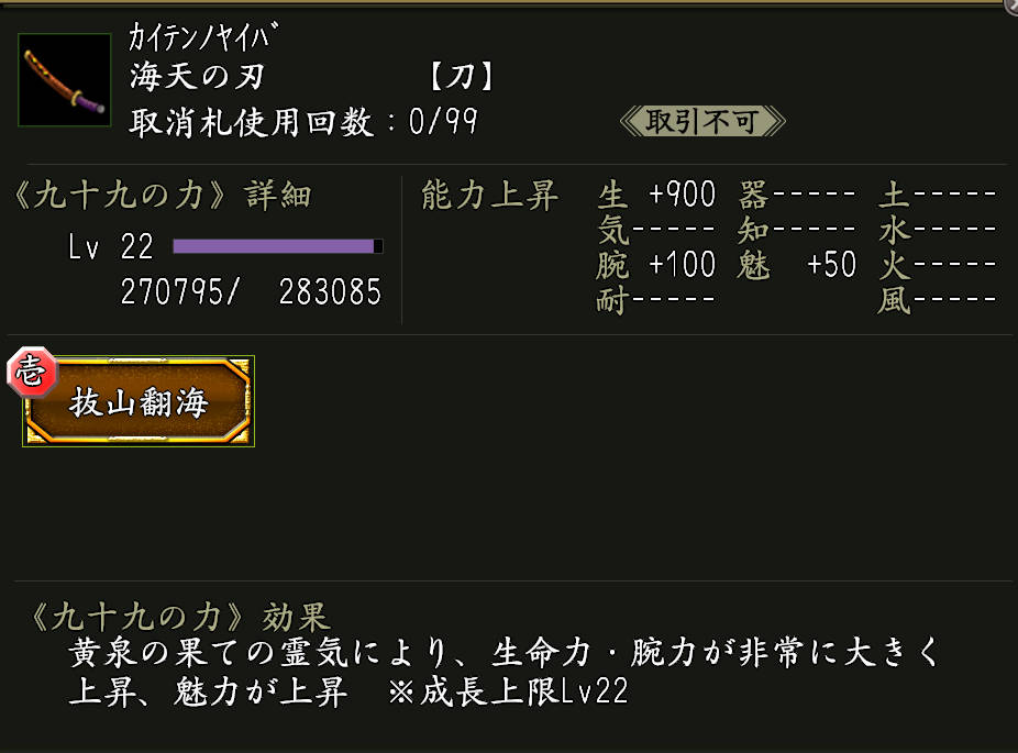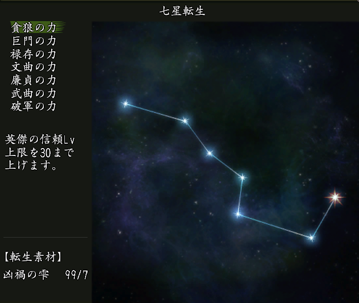 | 貪狼 | 《凶禍の雫》 7個 | 英傑の信頼Lv上限を30までに上げます。 |