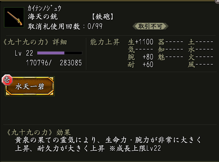 九十九の力「水天一碧(すいてんいっぺき)」(黄金枠)がついた武器。