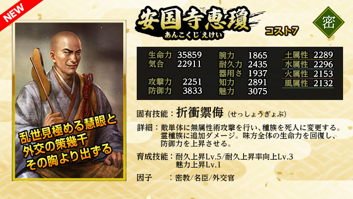 使用することで「英傑」を仲間にできる。 《英傑の招喚鈴・さ》の英傑に加え、英傑《前田利家・雄材》《安国寺恵瓊》《上杉憲政》が登場する。 入手済みの英傑が重複した場合、入手の代わりに限界突破が発生します。限界突破は最大4回で、以降は等級に応じた「英傑の零力」が手に入ります。 |
