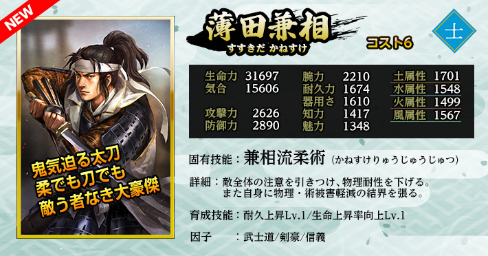 | 耐久上昇Lv.1 | 家臣闘練で修練内容に配置された時に、耐久力の上昇量を上げる。 | ||||||