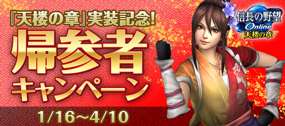 帰参者が、帰参者キャンペーン実施期間中に『信長の野望 Online』にログインすると、お手続きなしに14日間無料でプレイできます。