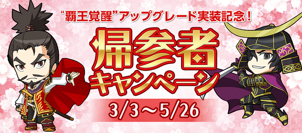 | 特典2 | 帰参者全員に「英傑」「家臣」のアイテムをプレゼント! |