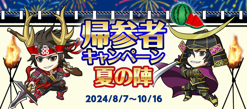 | 特典2 | 帰参者全員に「英傑」「家臣」のアイテムをプレゼント! |
