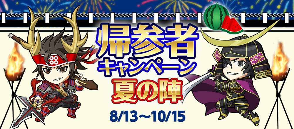 | 特典2 | 帰参者全員に「英傑」「家臣」のアイテムをプレゼント! |