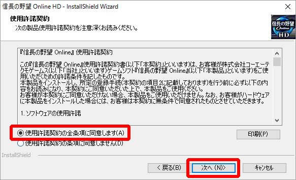 『信長の野望 Online』 使用許諾契約を読み、「使用許諾契約の全条項に同意します(A)」にチェックを入れ、「次へ(N)>」を押してください。