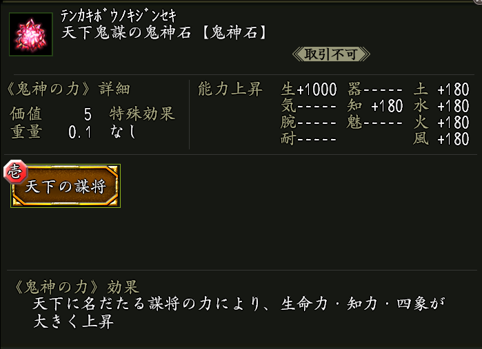 鬼神の力「天下の謀将」が付いた鬼神石。交換制限10個まで。