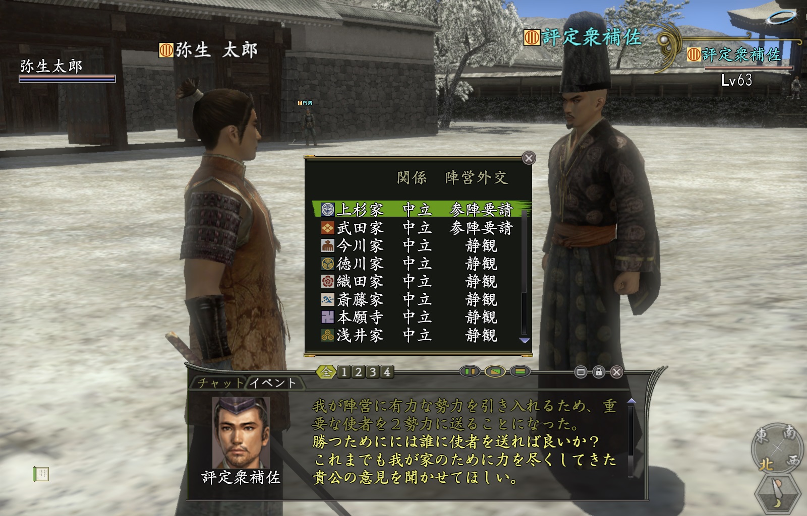 勢力に所属しているプレイヤーキャラクターは、自勢力のNPC“評定衆補佐”より参加できます。浪人のプレイヤーキャラクターは、加担したい勢力の評定衆補佐より参加できます。