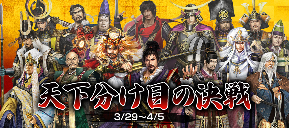 《天下無双祈願旗印》を装備した状態で、「天下分け目の決戦」の陣で戦闘をすると戦闘後に“天下決戦手柄”が500多く獲得できます。 ※《天下無双祈願旗印》の効果で手に入る“天下決戦手柄”は《天下分け目祈願札》の効果で2倍にはなりません。 ※今回の「天下分け目の決戦」の陣すべてで効果があります。 |