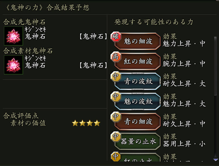 ・《鬼神石》の価値が高いほど、合成後の《鬼神石》に宿る《鬼神の力》の発現数が増えやすい