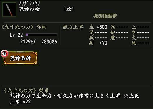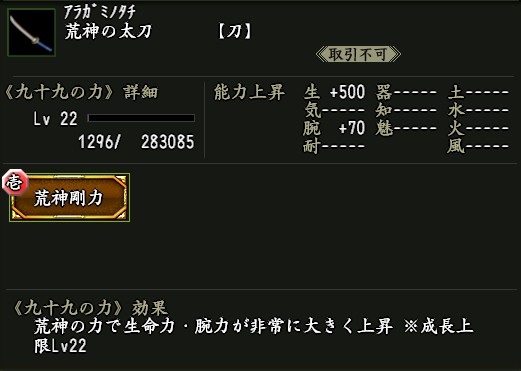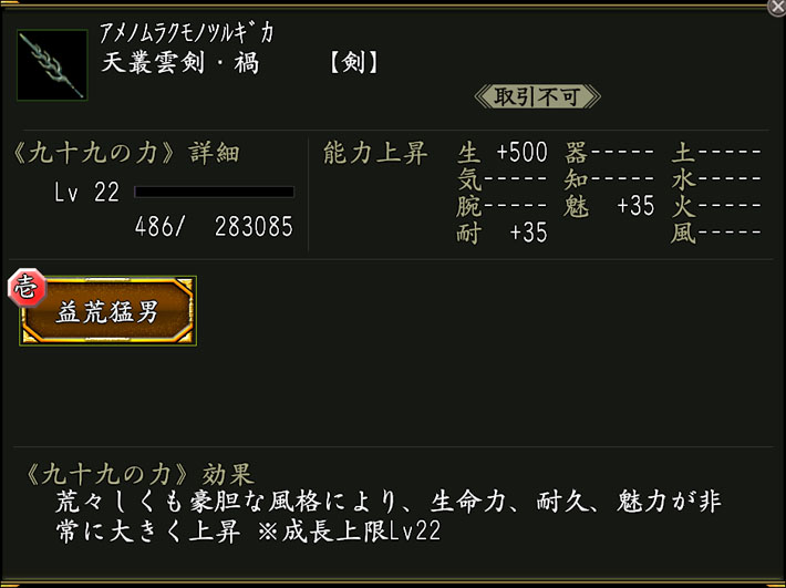 効果:九十九の力「益荒猛男(ますらたけお)」が付いた武器。