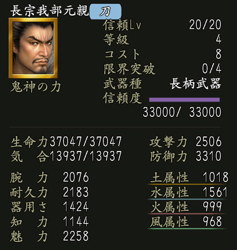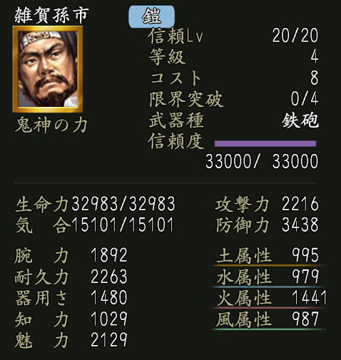 ※英傑の能力値は、全て「信頼レベル」20の場合のものです。初期状態では能力値が下がります。