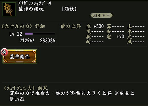 ※上記の武器に付与される「九十九の力」の能力値は、「九十九の力」Lv22の状態です。ポイントで入手できるアイテムの「九十九の力」はLv1となります。