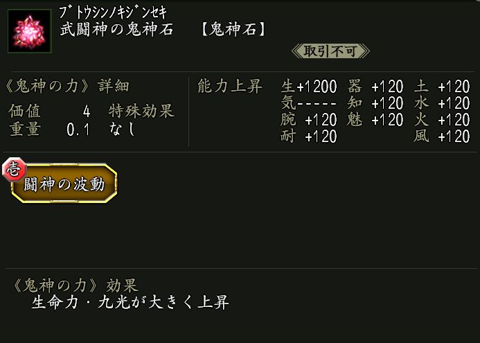 効果:鬼神の力《闘神の波動》が付いた鬼神石。