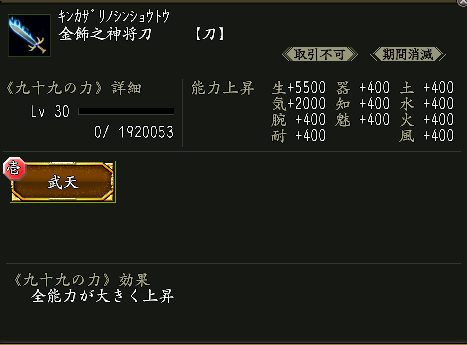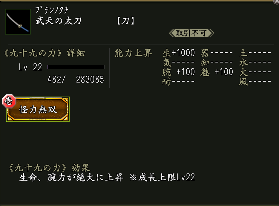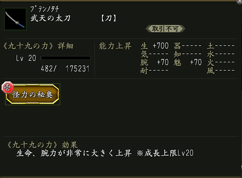 ※神将評勲の交換品に《怪力の秘奥》が宿った九十九武器《武天の刀》があります。