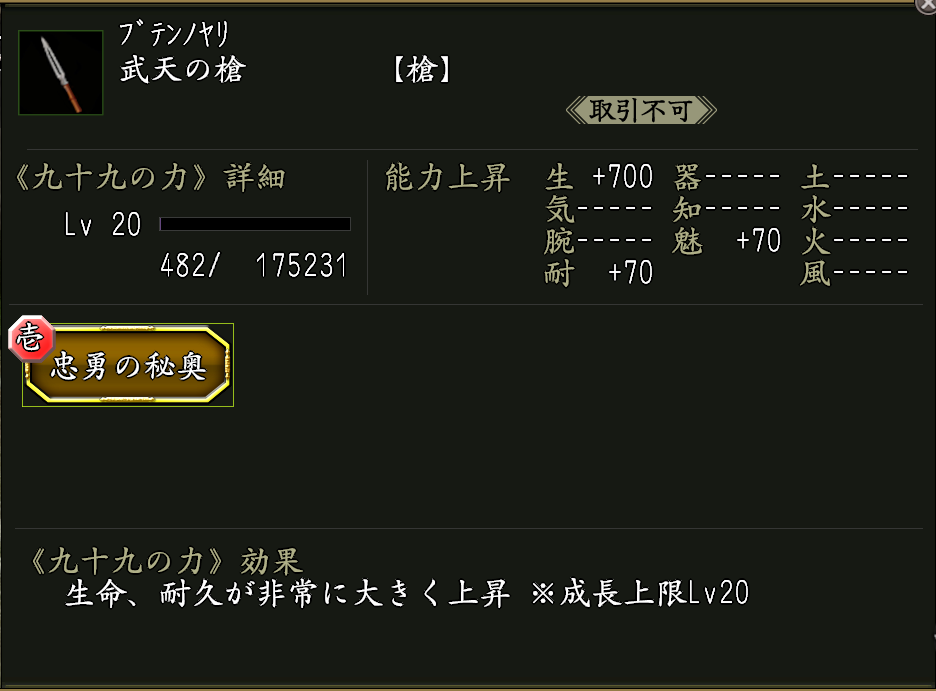 ※神将評勲の交換品に《忠勇の秘奥》が宿った九十九武器《武天の槍》があります。