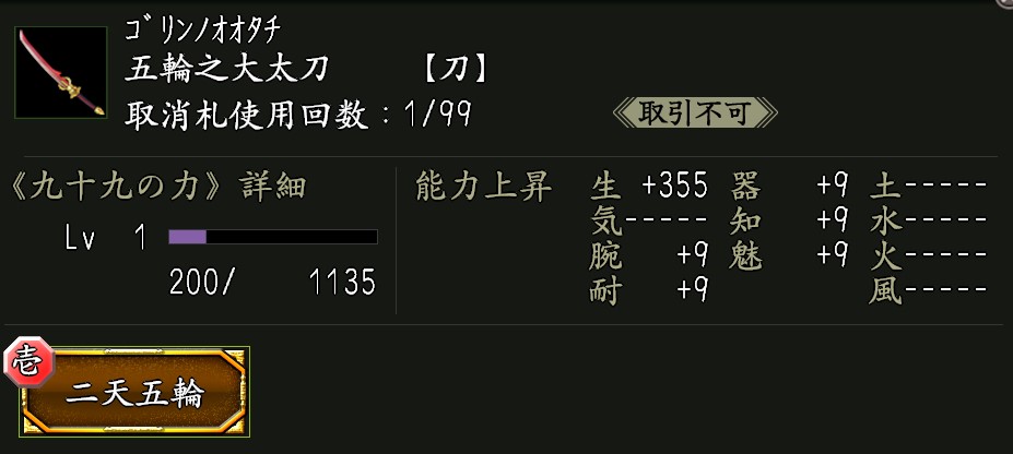 「九十九の力」(銀枠)がついた武器を1つ選んで取り出せる。 「無双の証」「鬼を討つ者」「豊穣の証」「桜華の証」「星河の証」 「紅葉の証」「魔祭の証」「海天の証」「親愛の証」「神獣の証」 「純忠の証」「魔空の証」「聖楽の証」「光輪の証」「春の証」 「星光の証」「団結の証」「星羅の証」「剣抜の証」「穢土の証」 「神気の証」「氷壁の証」「虎翼の証」「鍛錬の極意」「鬼気の証」 「奇稲田の証」「昇竜の証」「勇猛の証」「五行の証」「永遠の証」 「祓之一太刀」 「絢爛の証」「盛夏の証」「怒涛の証」「涼戦の証」「天翔の証」 「波濤の証」「鬼封の証」「堅固の証」「妖狐の証」「広闊の証」