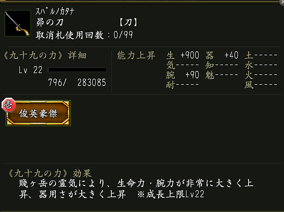 ※九十九の力《俊英豪傑》は、「銀九十九槍・俊英」に付いている九十九の力《俊英の証》を合成でランクアップさせていくことで発現します。