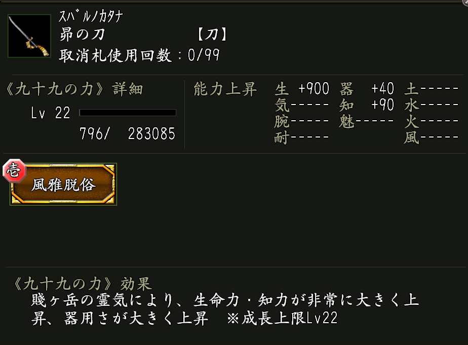 ※九十九の力《風雅脱俗》は、「銀九十九弓・風雅」に付いている九十九の力《風雅の証》を合成でランクアップさせていくことで発現します。