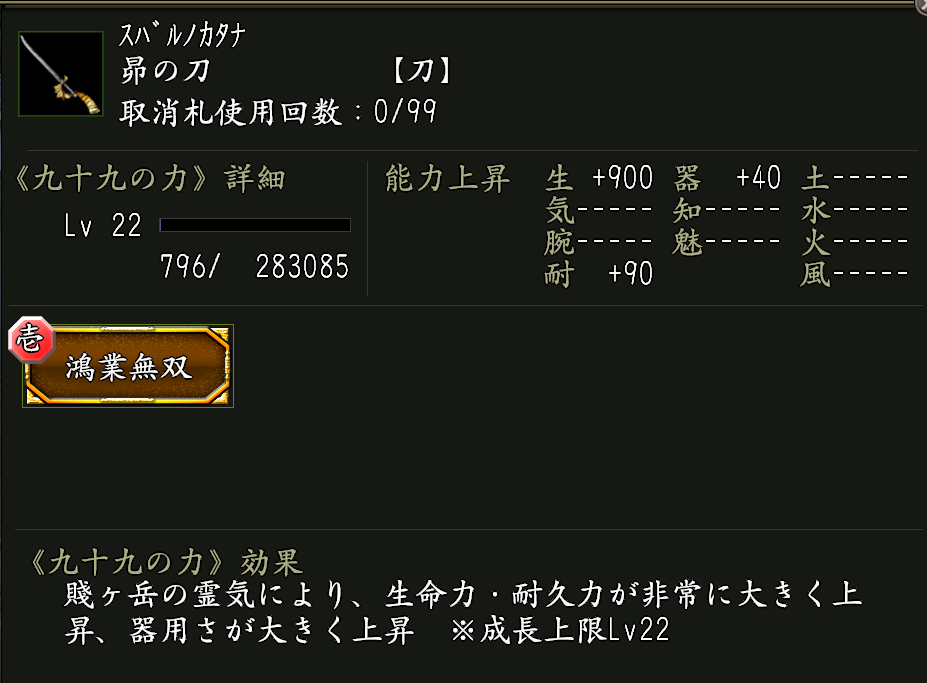 ※九十九の力《鴻業無双》は、「銀九十九刀・鴻業」に付いている九十九の力《鴻業の証》を合成でランクアップさせていくことで発現します。