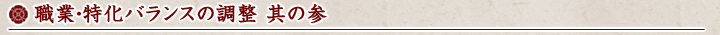 この特化系統ごとに様々な技能が使用できるわけですが、職業間や特化間のバランスを取ったり、個々の技能について強さや性能の見直しを行ったりと、皆さんのプレイ環境が向上するように、随時、調整を行っています。