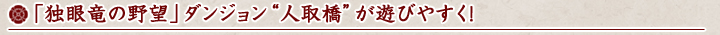 PlayStation®3版で新たに始められた方など、これまで「独眼竜の野望」ダンジョン“人取橋”(ひととりばし)を訪れたことのない皆さんにも、ダンジョンへ挑戦しやすくなるように入場条件を変更します。