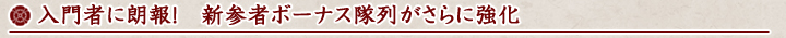 | 新参者条件 | 2010年12月15日(水)の00:00以降に取得した製品版アカウントのプレイヤーキャラクター ※新規で製品版アカウントを取得したか、体験版アカウントかネットカフェアカウントから製品版アカウントへ移行した場合に 条件を満たします。 ※体験版アカウント、ネットカフェアカウントのキャラクターは対象となりません。 |