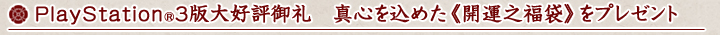 PlayStation®3版大好評のお礼と感謝の気持ちを込めて、有効な「新星の章」製品版アカウントをお持ちの方に、お礼アイテム《開運之福袋》(かいうんのふくぶくろ)をもれなくプレゼントします。《開運之福袋》を使用すると、装備品の強化やキャラクター育成に役立つアイテムをランダムで獲得できます。
