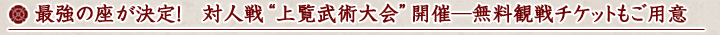 PlayStation®3版のサービス後初となる天照之演での上覧武術大会。まさに、全ワールド最強“武士”(もののふ)決定戦とも言うべき大会となっておりますので、「我こそは!」という方々の参戦をお待ちしております。