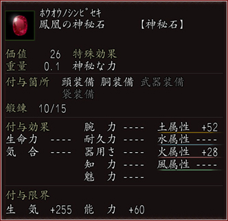 ・徒党員の「攻撃力、知力、魅力、命中率が10%上昇」、「防御力、土属性、水属性、火属性、風属性が15%上昇」する。 ・移動速度が速くなる。