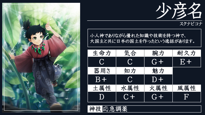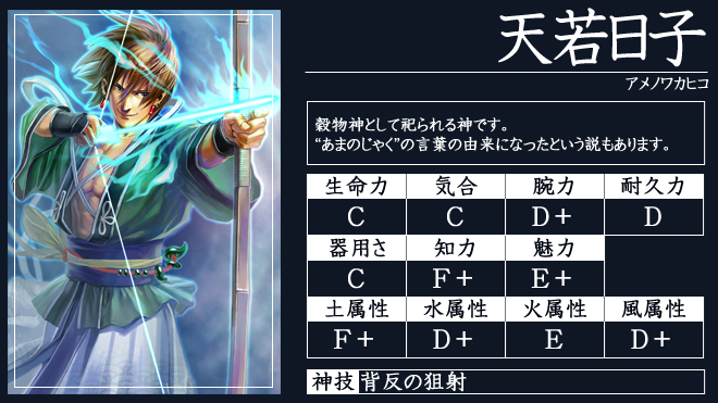 ※神々の各能力は相対的な評価をアルファベットで記載しています。神技は攻城戦の際に使用できる特殊能力です。