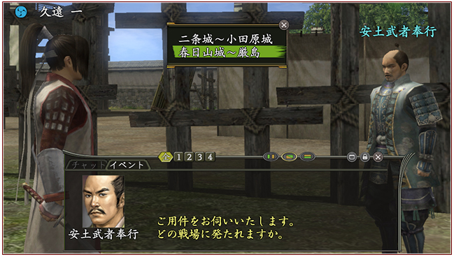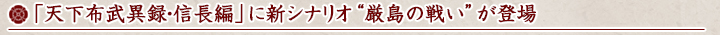 NPC“安土武者奉行”にて、「天下布武異録・信長編」の物語を最新の「厳島の戦い」まで一気に進められるようになります。
