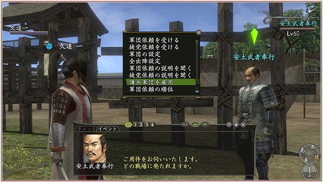 厳島の戦いでは、強力な助っ人である“傭兵軍団”をNPC“安土武者奉行”にて雇用できます。傭兵軍団の力を借りれば、まだ自分の軍団を育てていないプレイヤーでも“攻城戦”を楽しめます。