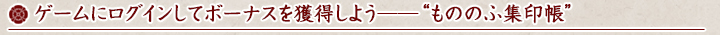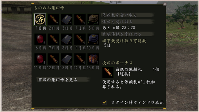- 報酬はもののふ集印帳からいつでも受け取れます。ログイン日数が15日を超えると、リセットされ1日目に戻ります。