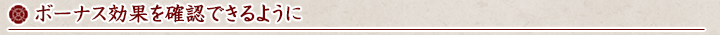 イベントでのワールドボーナスやアイテムの効果、《成長祈願札》の残り回数など、プレイヤーキャラクターに持続中の効果が、画面上で確認できるようになります。