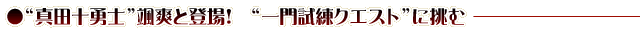 | “真田十勇士”の面々は、“一門”だけが挑戦できる“一門試練クエスト”に挑戦するようです。クエストを達成すると、難易度に応じた“殊勲”がもらえるほか、経験値や修得度、熟練度といった成長報酬も獲得できます。時には凄いお宝が手に入るとか!? “真田十勇士”各員の成長だけでなく、“一門”自体の拡張も望めそうです。 十勇士が団結すれば、クエストの達成など苦ではなさそうですね。 “一門試練クエスト”は、最初は1つしか選べませんが、達成するごとに新しいクエストが増えていきます。どのクエストを受けるかは“一門”が自由に選択できますが、いずれも1週間に1度しか達成報告はできません。 |