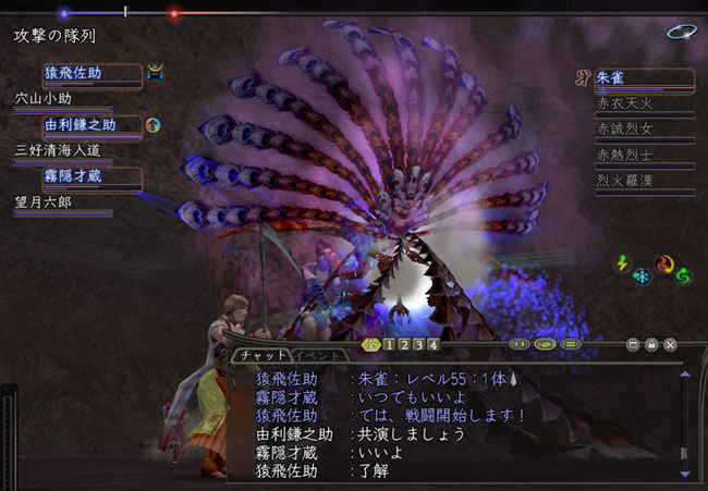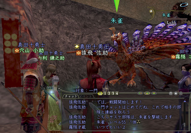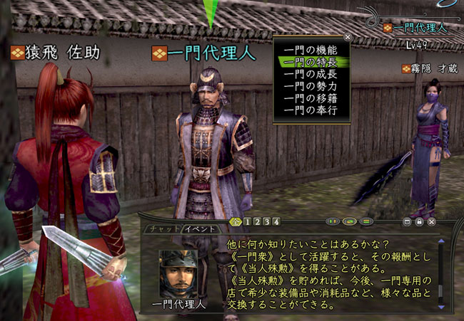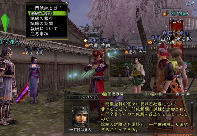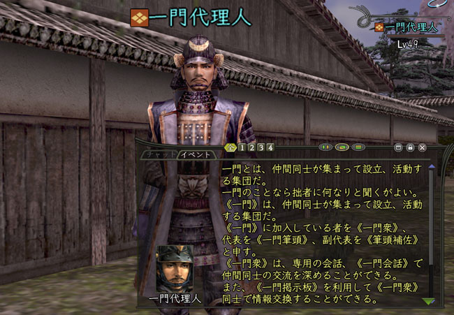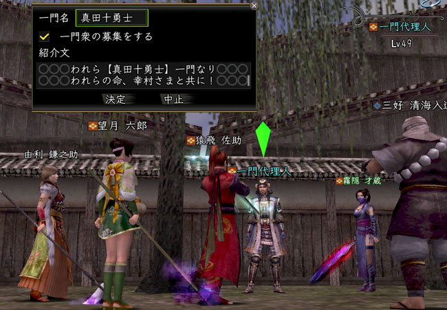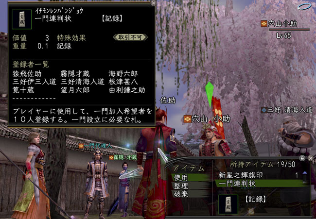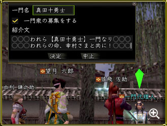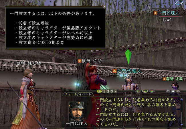 | 仲間を代表して“猿飛佐助”(さるとびさすけ)が、NPC“一門代理人”からアイテム《一門連判状》(いちもんれんぱんじょう)を入手。続いて《一門連判状》を“一門”に誘いたい仲間たちに使用して、各自から承認を得ます。10名の加入希望者が集まったら、“一門代理人”に報告しましょう。 設立条件を全て満たしていれば“一門”を結成できます。 |