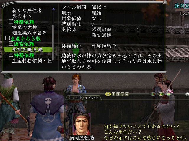 “藤岡屋伝助”から“生産かわら版”の通常依頼を受けます。その際、クエストを受けた町に即座に帰ってこられる《帰還の笛》と、材料を探すのに必要な《藤之黒鍬》(ふじのくろくわ)を手渡されます。