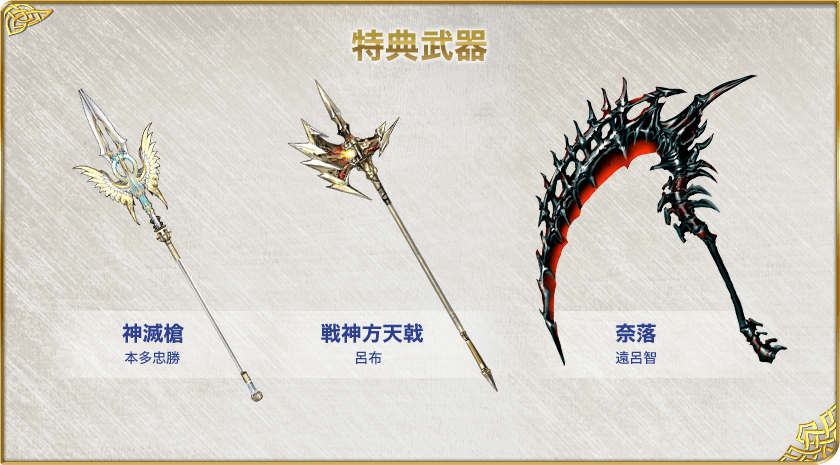 - 特典武器「神滅槍」、「戦神方天戟」、「奈落」
