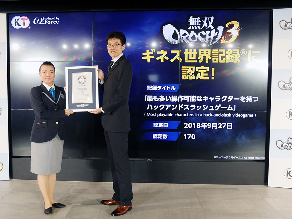 『無双OROCHI3』が、『最も多い操作可能なキャラクターを持つハックアンドスラッシュゲーム』(Most playable characters in a hack-and-slash videogame)として、ギネスワールドレコーズ™より世界記録として認定されました。