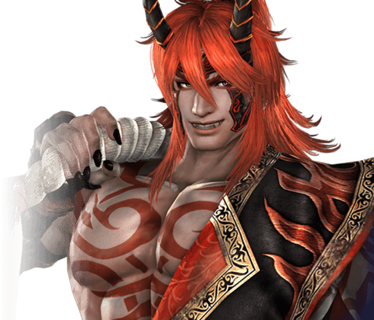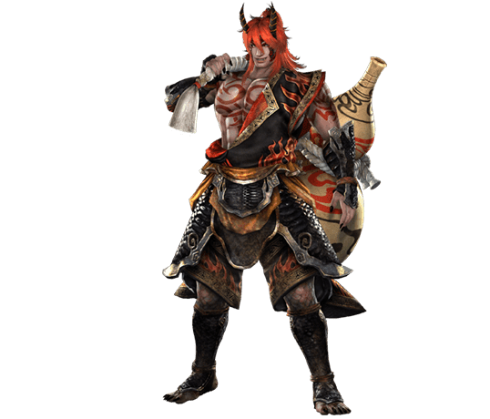 力強さと風格を兼ね備え、口元の金色の牙と、面頬から伸びる二本の角が、独特の風体を際立たせている。肩から背負った巨大なひょうたんを武器に、戦場に立つ。