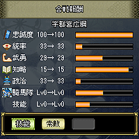 合戦を行うと、参戦させた武将を成長させる事ができ、更に新たに武将も手に入ります。
