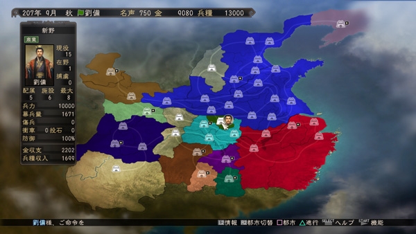 プレイヤーは三国時代の君主となり、中華統一を目指し戦います。 ゲームは基本的にこの「メイン画面」で進行していきます。 全40の都市を巡り、群雄たちの戦いが中国全土で繰り広げられます。