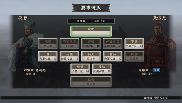 要求内容として同盟や要請など約定だけではなく、物資なども選べます。