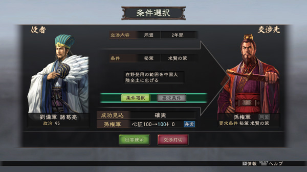 高い政治力と弁舌の特技を併せ持つ諸葛亮を外交に派遣します。