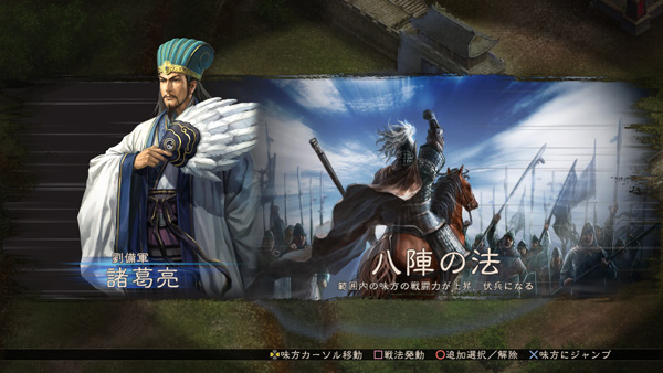 範囲内の味方の戦闘力を上昇し、伏兵状態にする諸葛亮固有の大技。