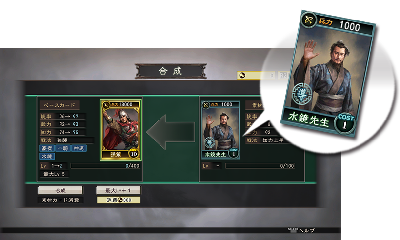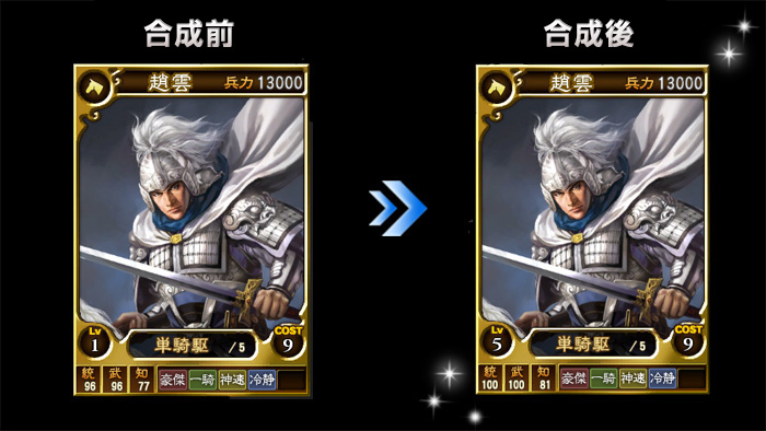 余ったカードを役立てることで、お気に入りの武将をパワーアップすることができる、お得なシステムです。