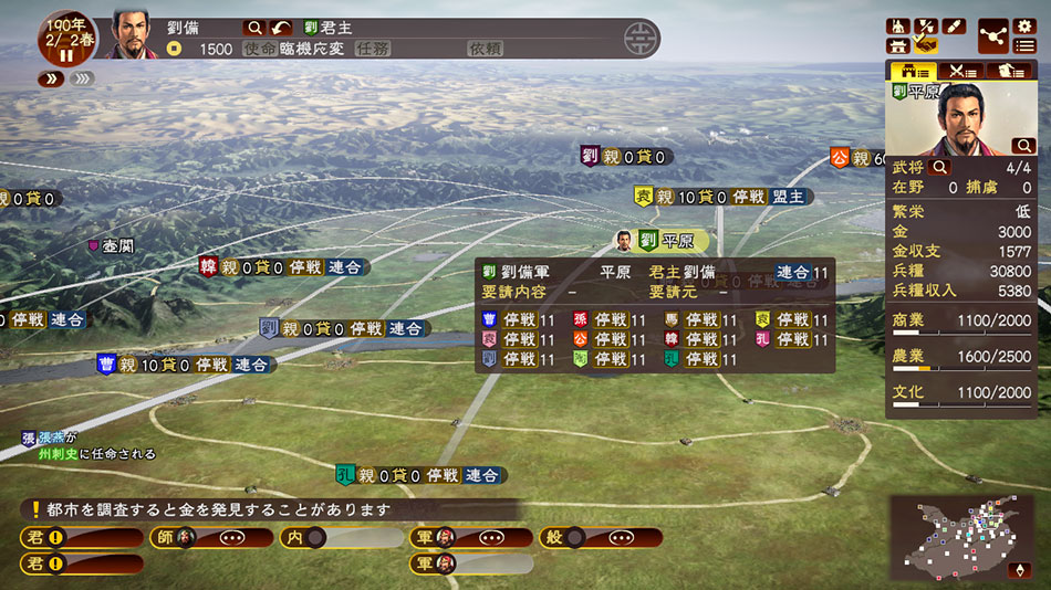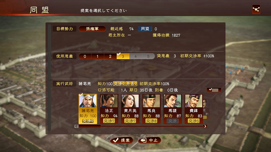 「恩義」は、金や貢物を送ったり相手からの要求に応えることで獲得でき、多くの「恩義」を得ることで、外交を有利に進めることができます。 また、プレイヤー武将が使者になった場合は、人間関係を駆使した「口添」や「折衝」による舌戦で「交渉率」を上げていくことで、困難な交渉を成功に導くことが可能です。