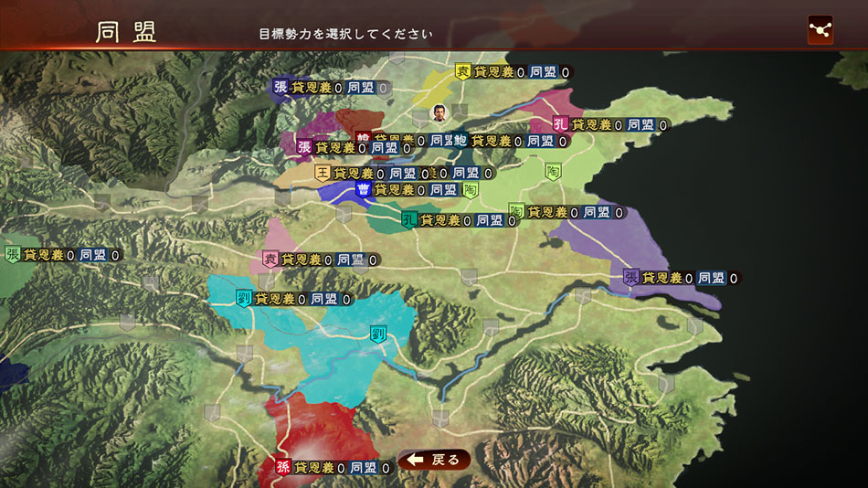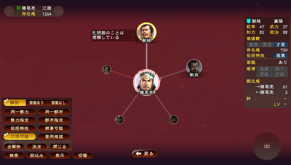 他の勢力との外交戦略では、勢力間のさまざまな交流による「恩義」と、相手勢力の武将からの推薦を得て「交渉率」を上げることが重要になります。