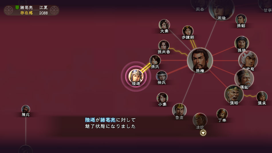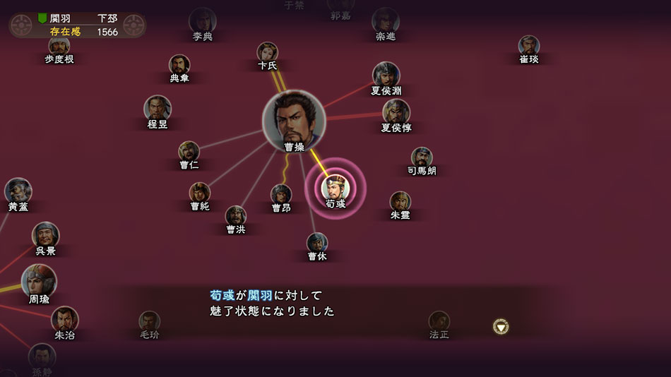 強力な武将に勝利することで、他の武将の自分に対する感情を「魅了」状態にすることがあり、その武将との親近感が上がりやすくなったり、一度だけ「師事」をさせてもらえるようになるなど、プレイヤー武将のさらなる成長につなげることができる。