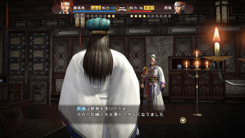 「舌戦」は、ふたりの武将がそれぞれの主張をぶつけ合う論説による戦いで、外交や評定、武将登用時などなまざまな場面で発生します。